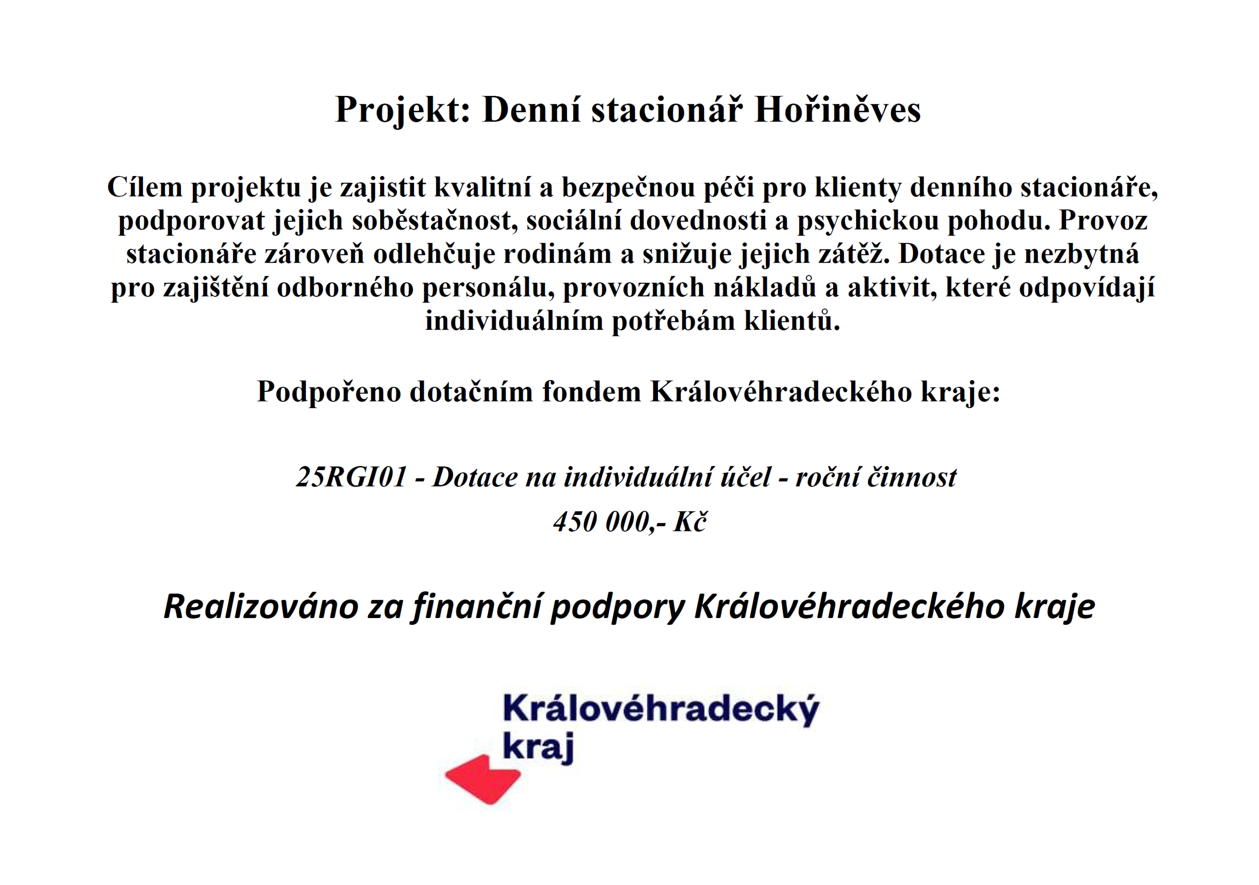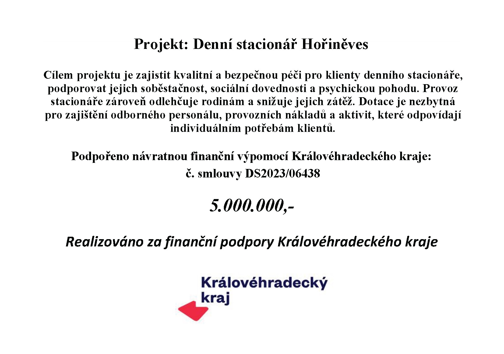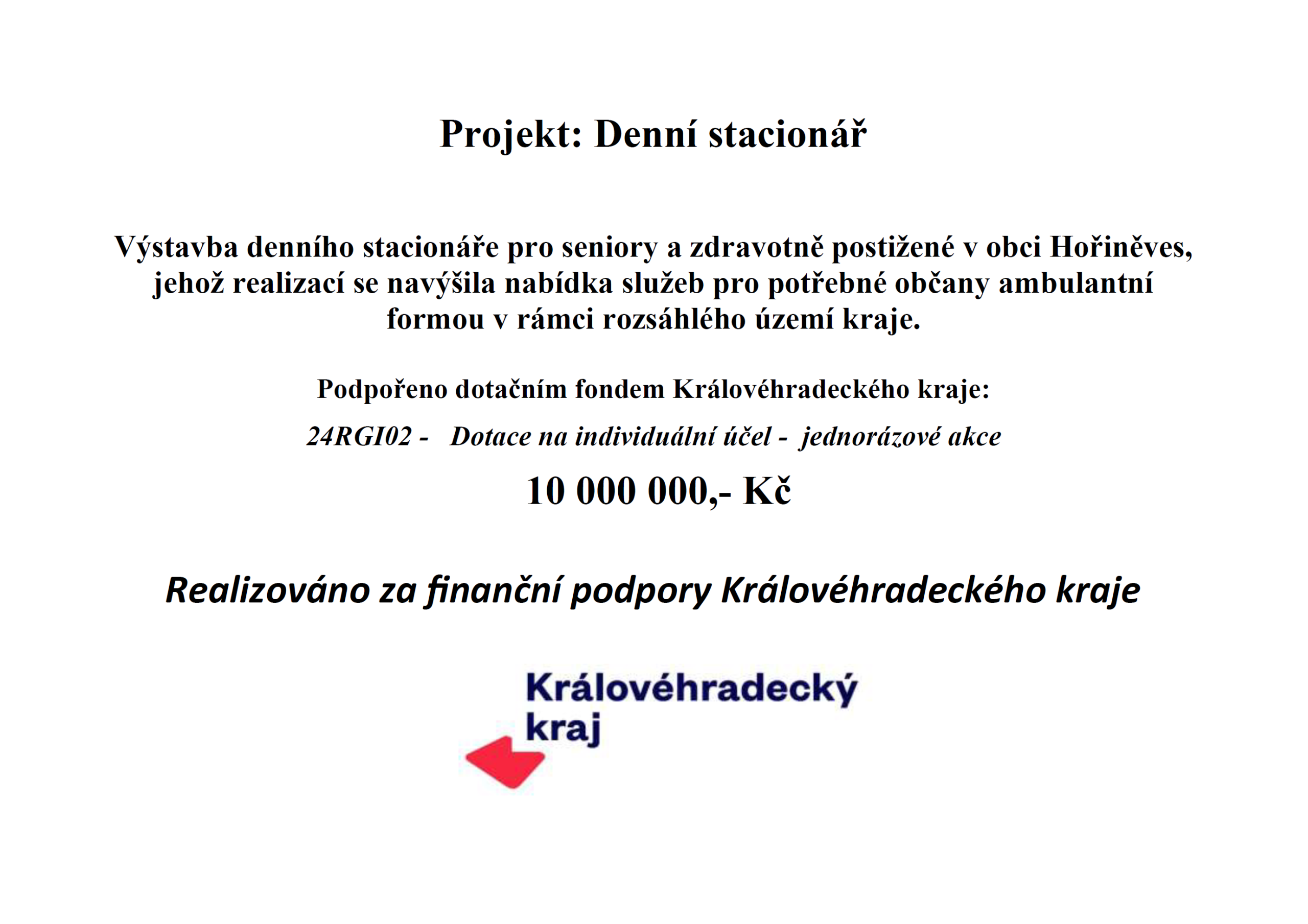Cílem projektu je vybudování nového denního stacionáře sociálních služeb v obci Hořiněves s kapacitou 25 osob.